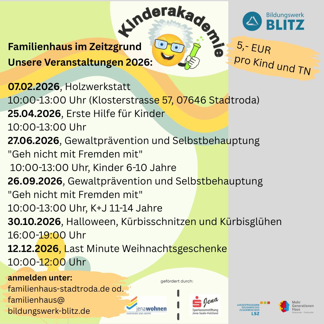 Seit Herbst 2021 beherbergt Bildungswerk BLITZ e.V. zwei wunderbare Projekte für Menschen von 0-99 Jahren im Zeitzgrund 6 in Stadtroda. Das seit nunmehr 13 Jahren erfolgreich bestehende Mehrgenerationenhaus und das neu entstandene Familienzentrum. Ermöglicht wurde dies durch Mittel aus dem Landesprogramm für solidarisches Zusammenleben der Generationen (LSZ). Damit konnten zusätzliche Personalstellen geschaffen werden um neue Angebote für Kinder, Jugendliche und die ganze Familie zu schaffen.